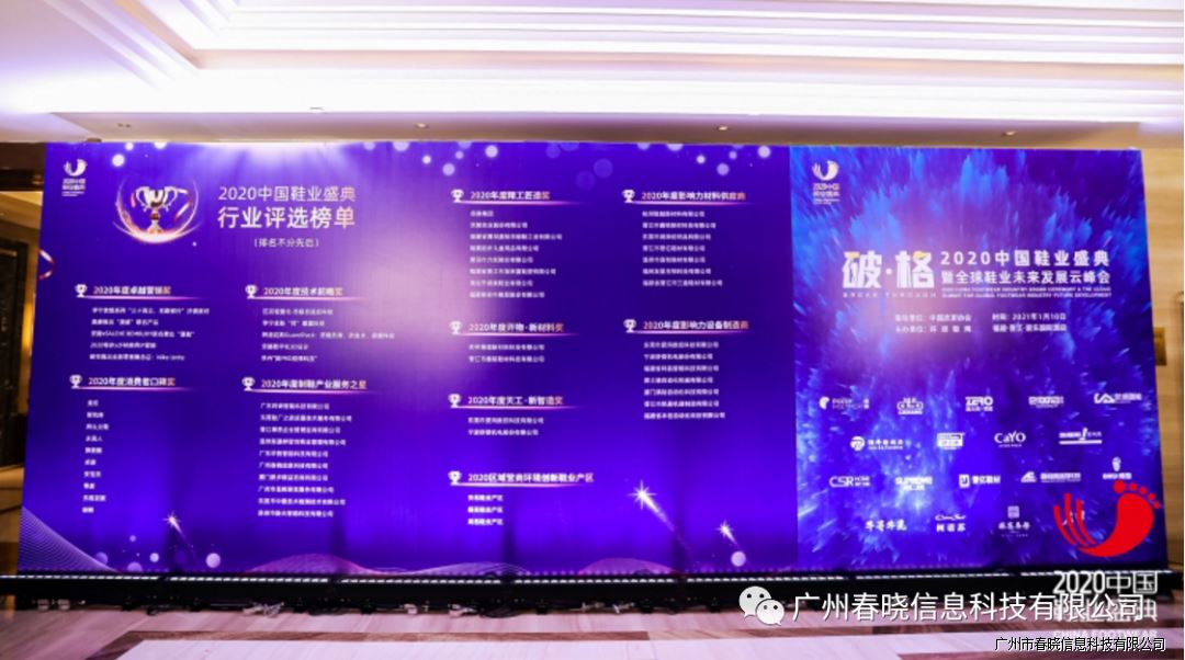 2021年1月10日,在中国鞋都晋江,通过导播台信号,2020中国鞋业盛典的现场从微信小程序及微信视频号输出直播,包括美国、欧洲、东南亚、印度等地以及国内12万多观看者,与现场鞋业精英一起,参与了这场以“破·格”为主题的云峰会。