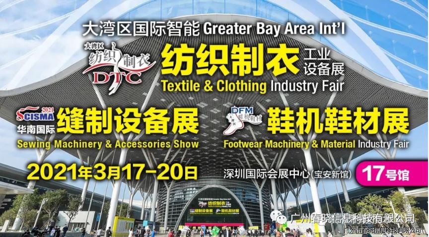3月17-20日2021大湾区国际智能纺织制衣工业设备展华南国际缝制设备展、鞋机鞋材工业设备展、(以下简称“DTC&SCISMA展”)将在深圳国际会展中心(宝安新馆)·17号馆举行。